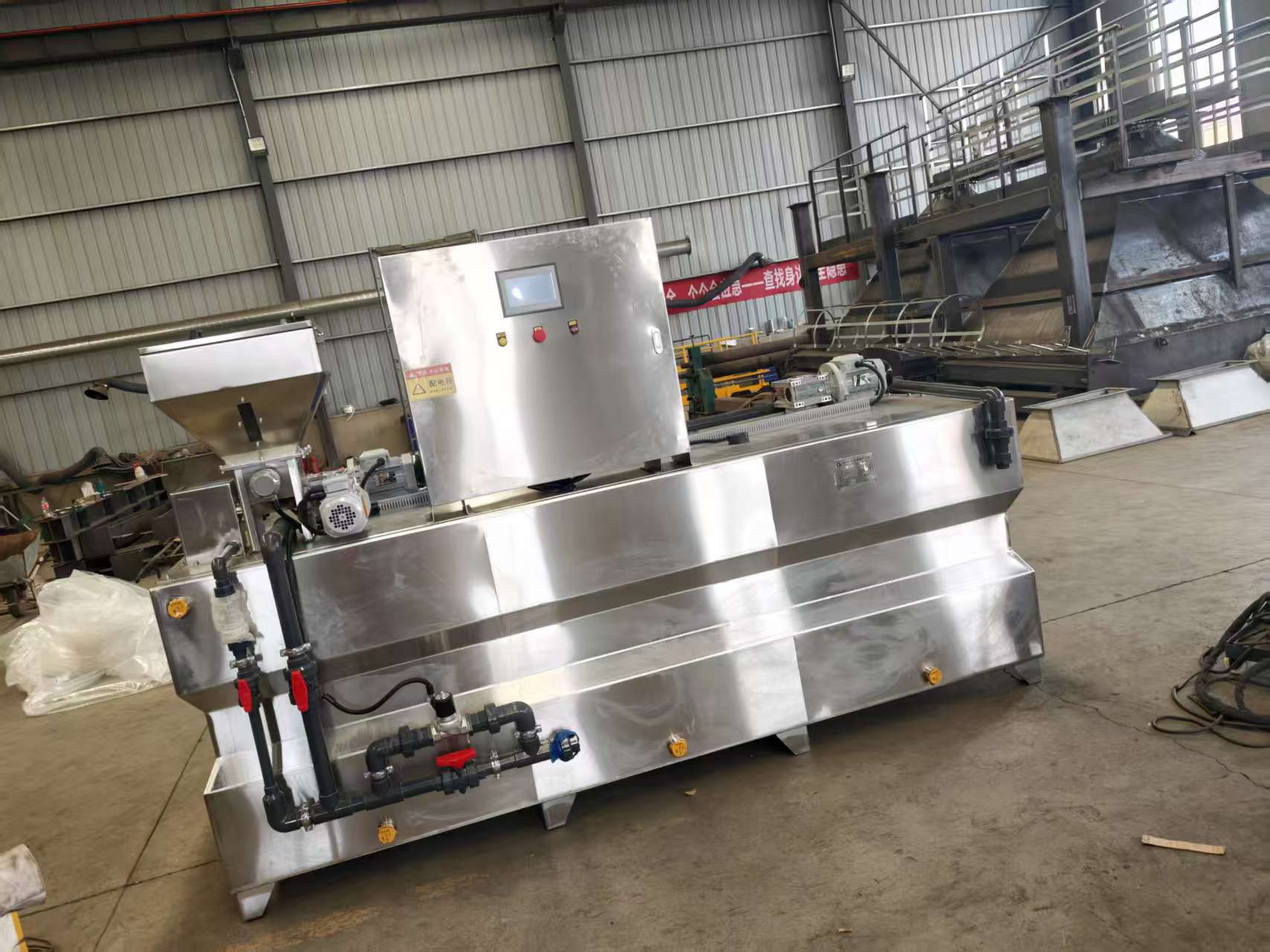 2、系统稳定可靠,有故障时相关设备会自动按要求停止。3、采用螺旋给料器投加粉体,速度变频控制,保证投料均匀、分散、精度在1%以内4、采用不锈钢材质,抗腐蚀性好,美观,使用寿命长。5、采用三槽溢流式溶液操作系统,使设备结构简单、体积小、安装方便。适用于连续溶解和连续添加药剂的环境。
