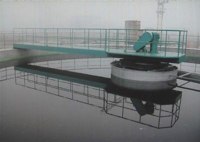 刮泥机分为ZG型中心传动刮泥机和BG型周边传动的刮泥机,主要有驱动机构、传动轴、刮、水下轴承及集泥槽刮板等部件组成。原水经中心配水简布水后呈辐射状流向池子周边,随着流道的降低,水体中的悬浮物被分离面沉降于池底,上清液通过溢流堰板由出水槽排出池外,污泥则由刮板刮集到中心集泥槽,依靠静水压力或系排出池外。可选配浮渣刮集排除装置和扭力过载保护装置